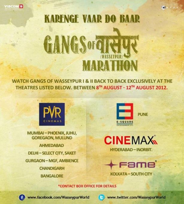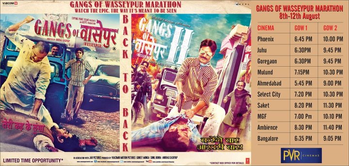 The opinion is still divided on whether 1 is better or 2, but one thing is for sure 1+2 = Epic Masterclass in Filmmaking! A rare feat which only few can dare to imagine and then translate it onscreen into cinematic orgasm of almost 6hours. There are few theatres across the country which are showing both the parts back to back (see pics). If you can, you must go for one of these marathons.