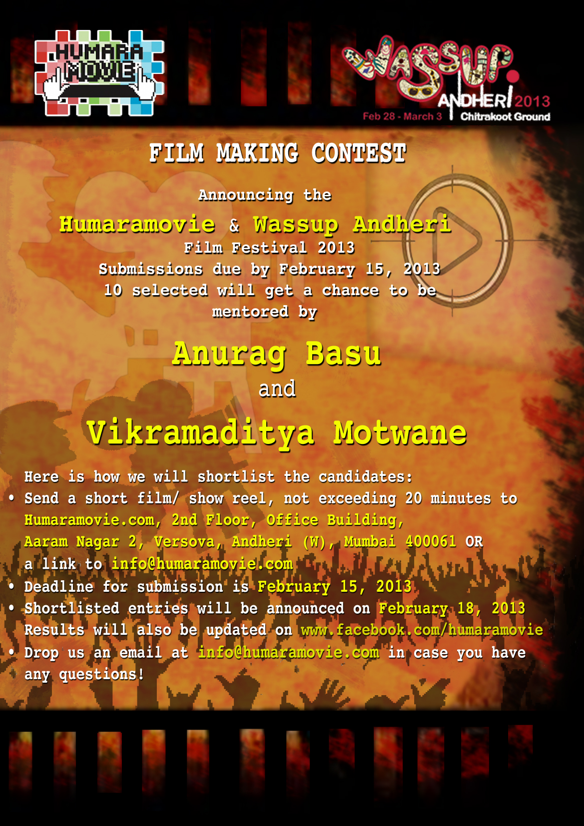 The Wassup Andheri festival and humaramovie.com, come together to give aspiring filmmakers a unique mentoring opportunity! Submit your entries to interact and engage with the two leading lights of Indian cinema – Anurag Basu (Director Barfi) & Vikramaditya Motwane (Director Udaan). 10 selected entries will be making their films on a topic suggested by the mentors. All shortlisted candidates will get access to a script consultant, editing consultant & sound consultant.