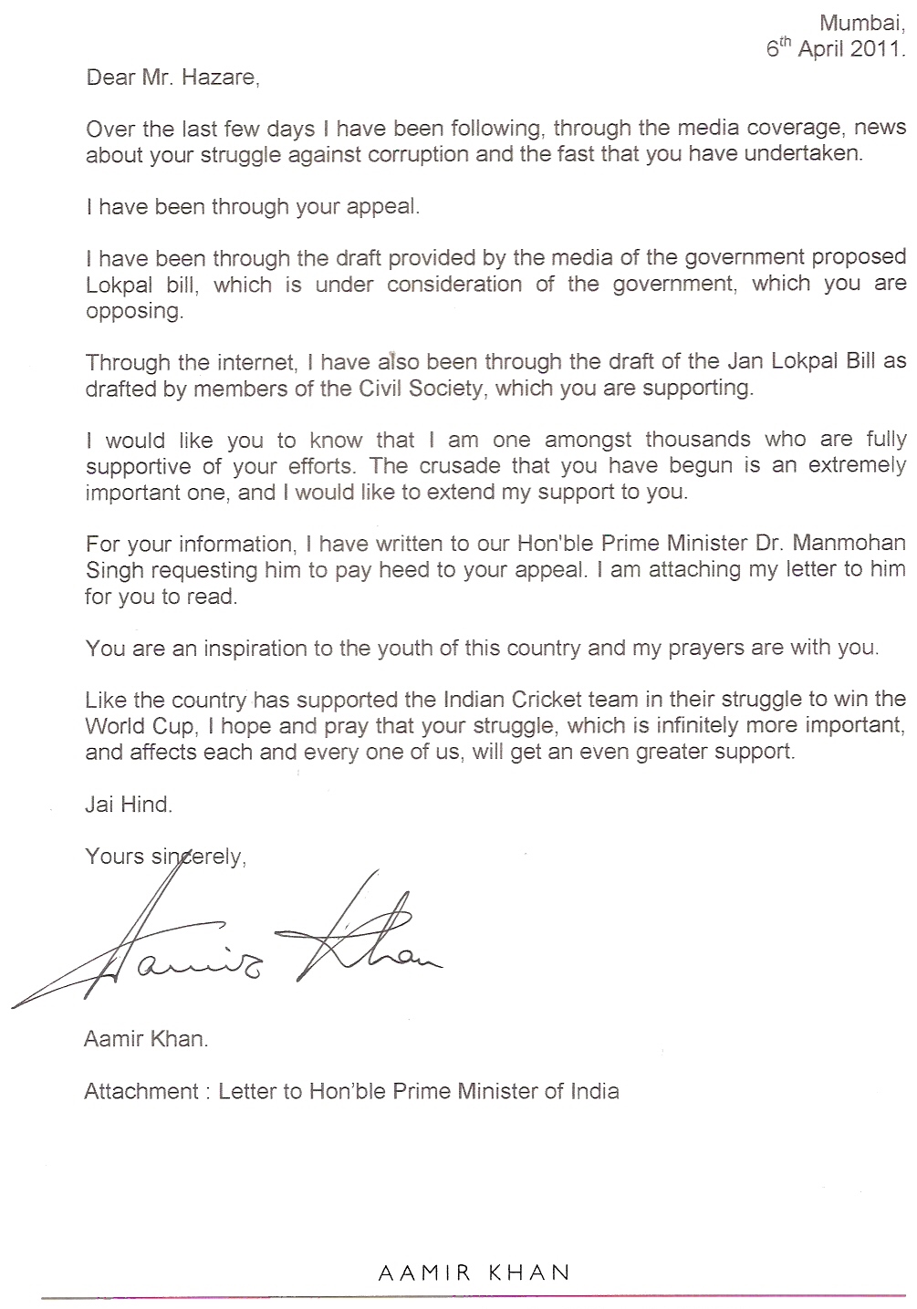 We often accuse our stars of not taking a clear stand, and of being non-political. So, it makes sense that when they decide to support a cause, we highlight it too. Actor Aamir Khan has written a letter to PM Dr. Manmohan Singh and has expressed his support for Anna Hazare on Jan Lokpal Bill. And the second letter is addressed to Anna Hazare. Read on…
