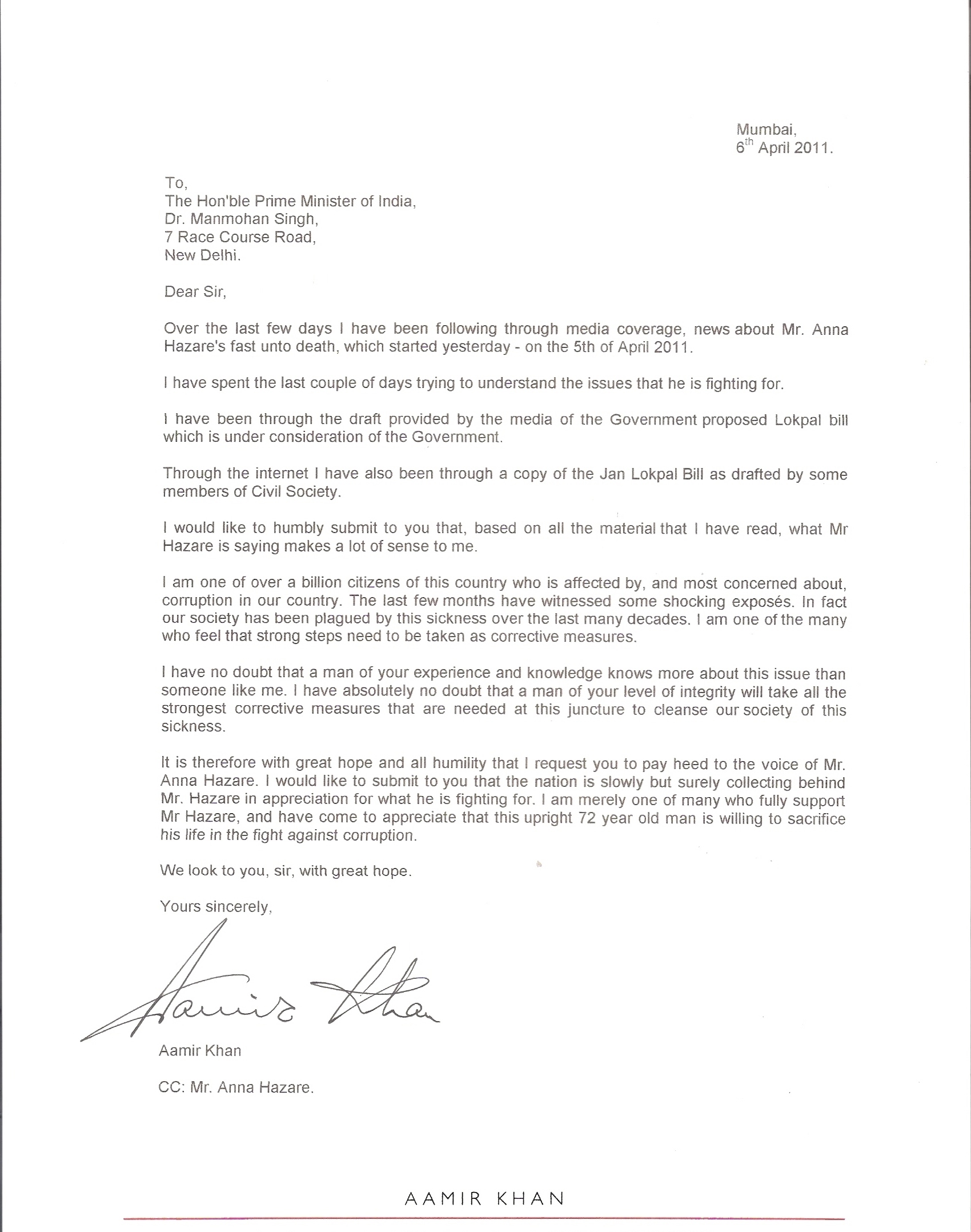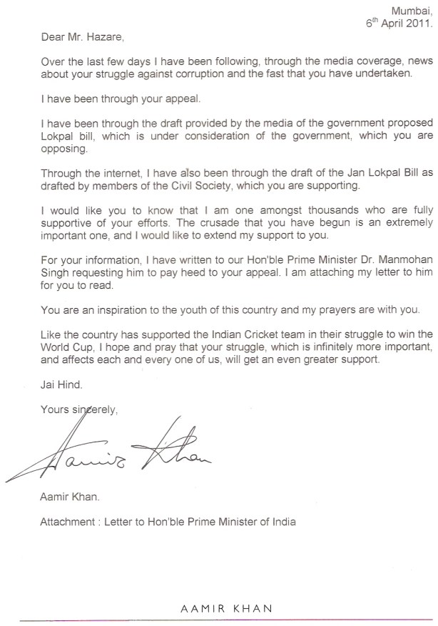 Aamir Khan’s letter to PM and Anna Hazare