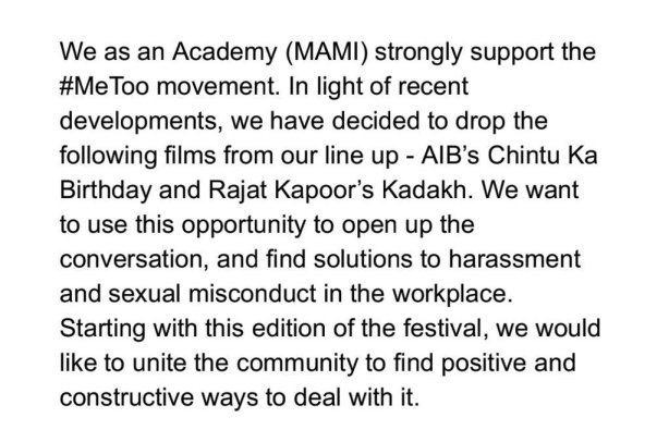 We as an Academy (MAMI) strongly support the #MeToo movement. In light of recent developments, we have decided to drop the following films from our line up – AIB’s Chintu Ka Birthday and Rajat Kapoor’s Kadakh. We want to use this opportunity to open up the conversation and find solutions to harassment and sexual misconduct in the workplace. Starting with this edition of the festival, we would like to unite the community to find positive and constructive ways to deal with it.