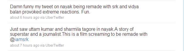 So, its easy to connect Satyajit Ray and Nayak. But Shah Rukh Khan ? Well, courtesy some Pillai who thinks “its screaming to be remade into a film with Shah Rukh Khan”. There comes BLASPHEMY! BLASPHEMY! Aren’t there better ways to suck up to the stars ? Here’s what he tweeted after watching the film..