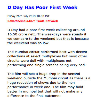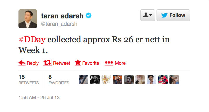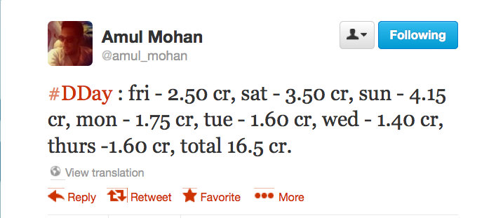 This difference in the figure actually started from its opening weekend. Going by Taran’s tweet, D-Day opened with a collection of Rs 13.69 crs net. For the same three days, Amul tweeted the figure of Rs 9.65 crores net. And strangely, the figure given by DAR Motion Picture (Producer of D-Day) is something else – Rs 12 crores as quoted in this report. If you compare Taran and Amul’s numbers, the opening day collection is still close (Rs 2.94/2.50), but looks like Taran’s figures suddenly got wings from saturday.